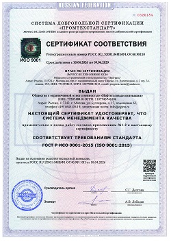Компания ООО «Нефтегазовые инновации» имеет Сертификат соответствия требованиям стандарта ГОСТ Р ИСО 9001-2015 (ISO 9001:2015) системы менеджмента качества применительно к инженерным изысканиям, инженерно-техническому проектированию, управлению проектами строительства и строительных работ.
