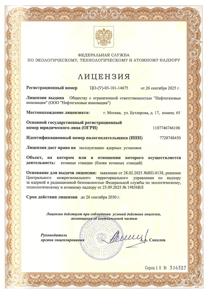 В сентябре 2025 года компания ООО "Нефтегазовые инновации" получила лицензию Федеральной службы по экологическому, технологическому и атомному надзору на право эксплуатации ядерных установок атомных станций. Регистрационный номер лицензии ЦО-(У)-03-101-14675.