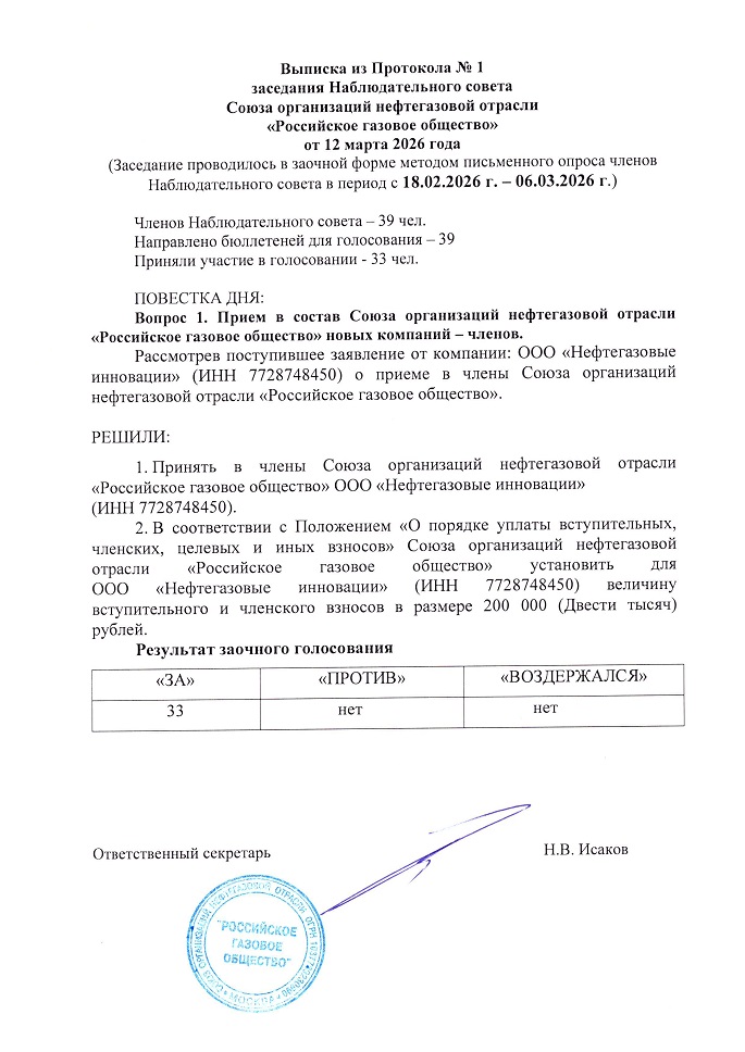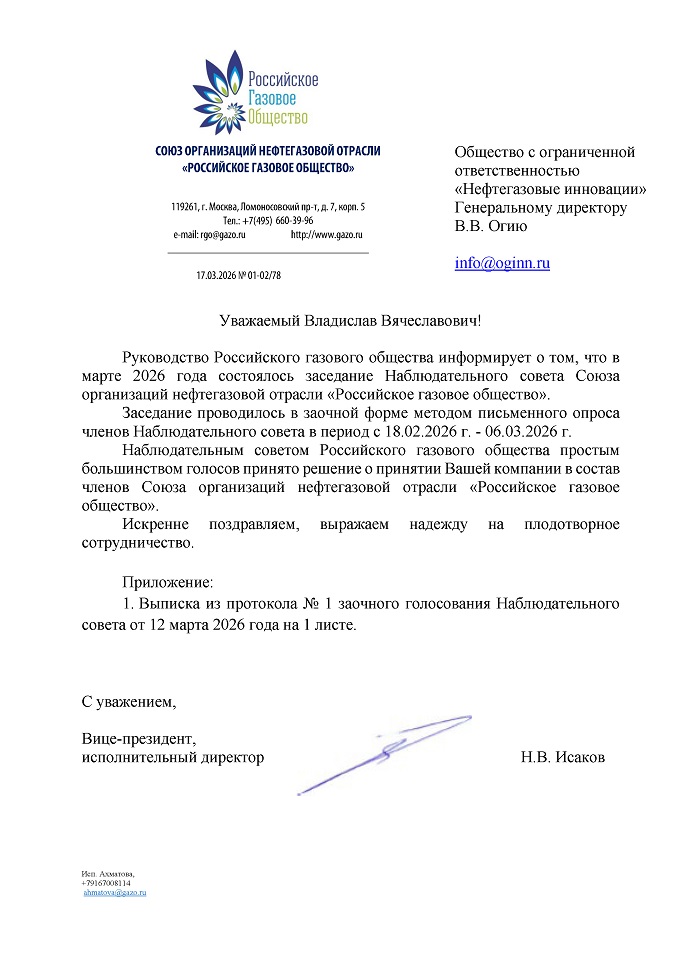 В марте 2026 года компания ООО «Нефтегазовые инновации» вошла в состав членов Союза организаций нефтегазовой отрасли «Российское газовое общество».