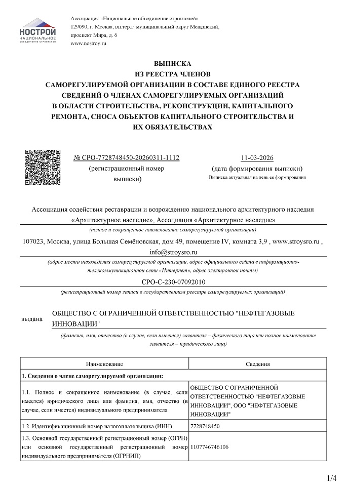 В 2019 году компания ООО «Нефтегазовые инновации» вступила в члены Саморегулируемой организации Ассоциации содействия реставрации и возрождению национального архитектурного наследия «Архитектурное наследие» (СРО-С-230-07092010) и имеет право выполнять следующие виды работ: строительство, реконструкция, капитальный ремонт, снос объектов капитального строительства по договору строительного подряда и по договору подряда на осуществление сноса.