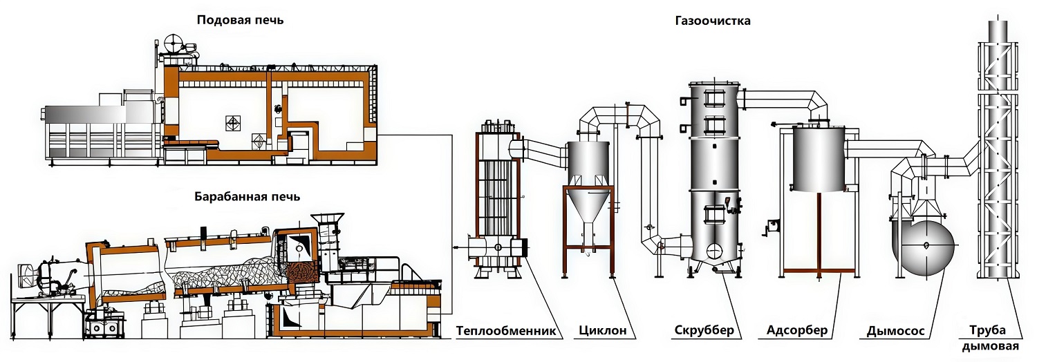 «Сухая» очистка отходящих газов в пылеуловителе (циклоне). «Сухая» или «мокрая» очистка отходящих газов в химическом абсорбере (скруббере). Улавливание тяжёлых металлов в адсорбере (при необходимости). Финишная очистка в рукавном фильтре (при необходимости).